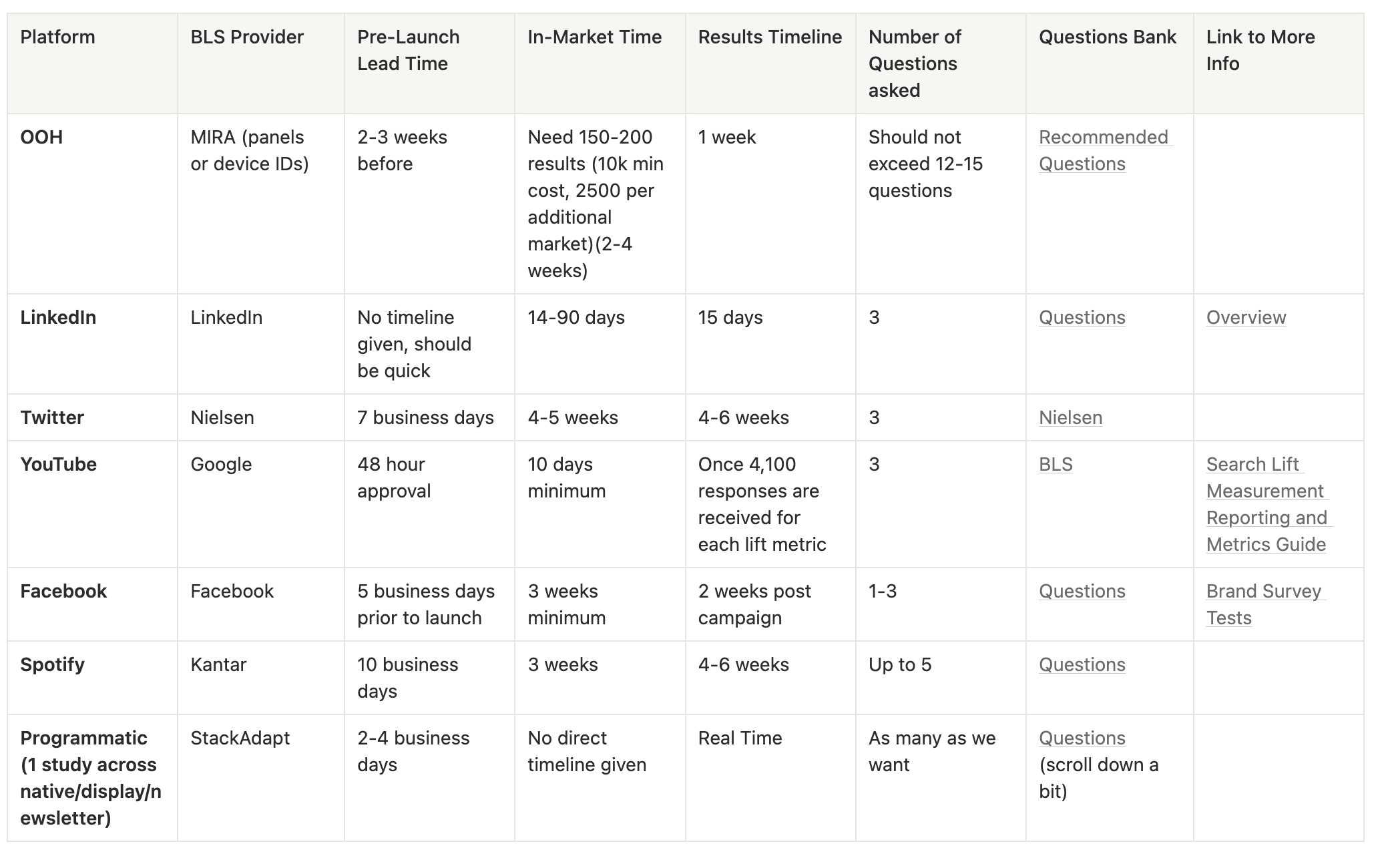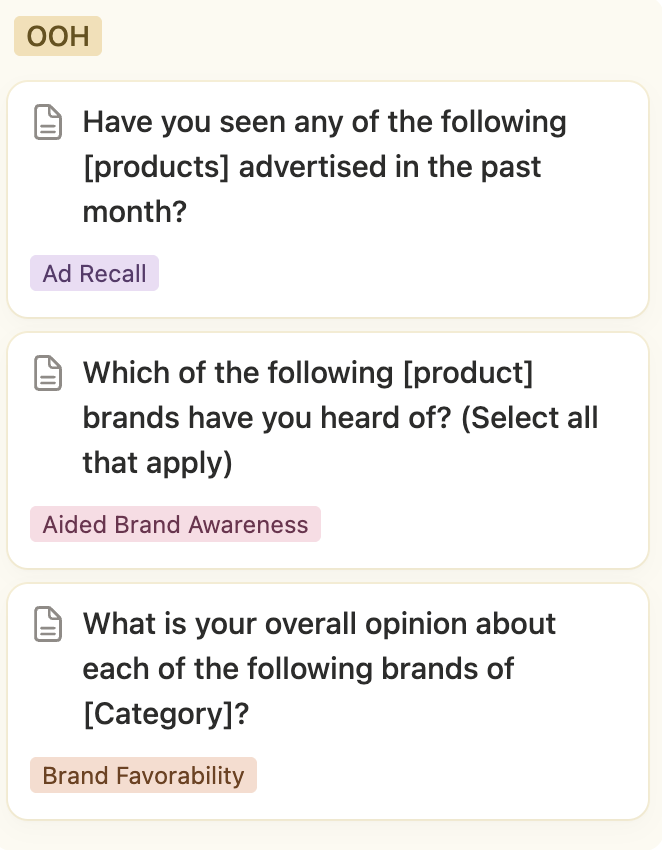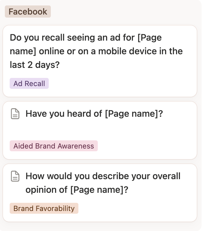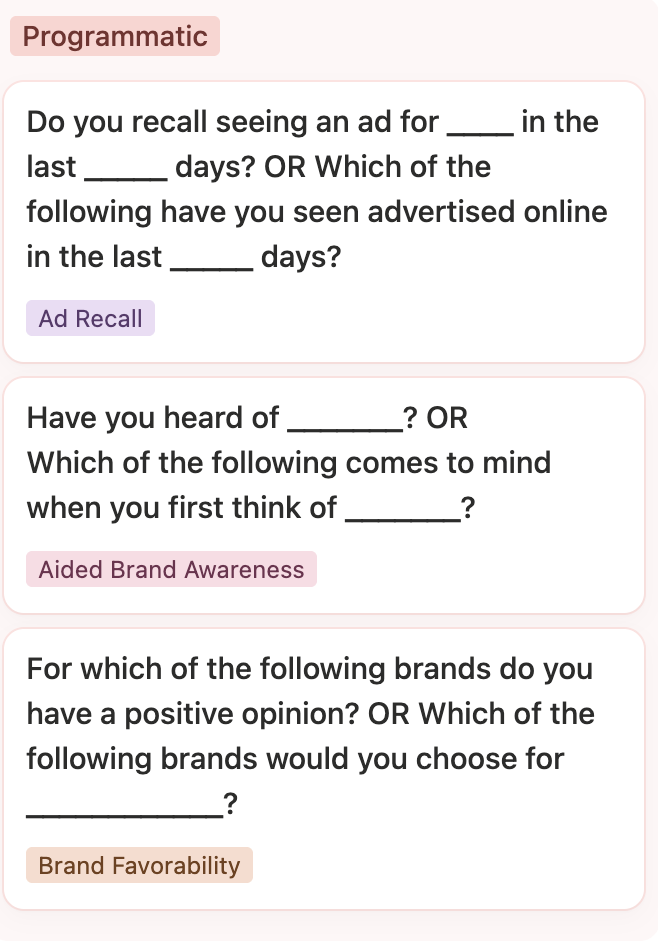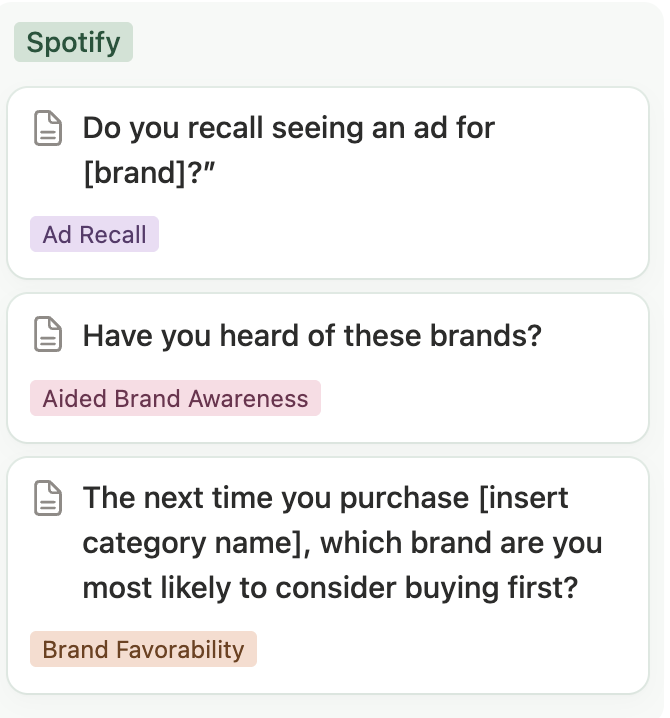 We can choose to measure any number of brand metrics, then determine the questions included in the surveys. We recommend asking the same questions across all platforms.
