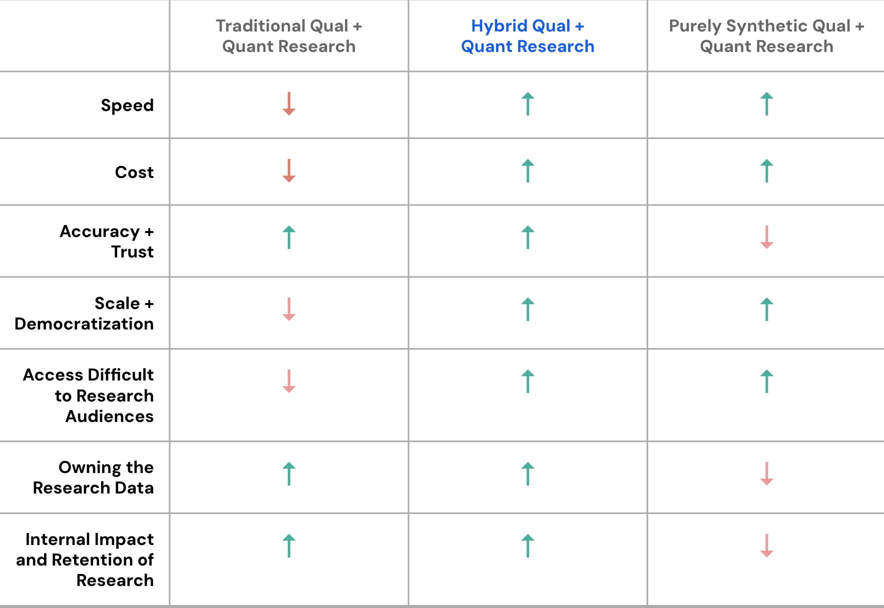 As the synthetic research space develops, many new tools optimize for speed, sometimes with thin governance. Research firms offer rigorous studies that take months and can slow down decision-making. We've deliberately built in the whitespace between them — a governance-first, human-led hybrid that makes transparency a feature, not a footnote. That means publishing validation protocols, acknowledging model limits, and treating divergence between synthetic and human findings as a diagnostic signal rather than an error to hide.