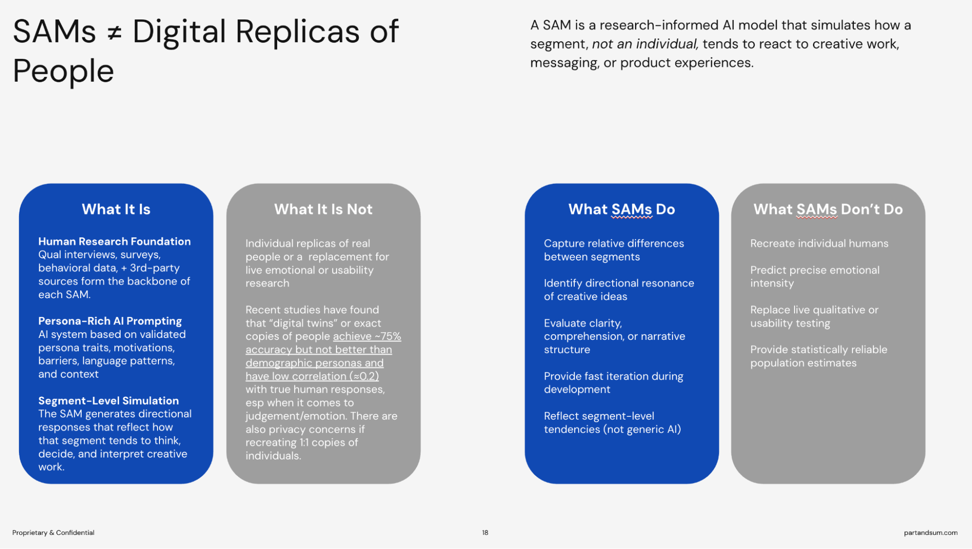 We then generate Synthetic Audience Models (SAMs). SAMs are conversational interfaces, built in a moderated AI environment, that teams can interact with directly, guided by trained Part and Sum strategists using structured prompt methodologies.